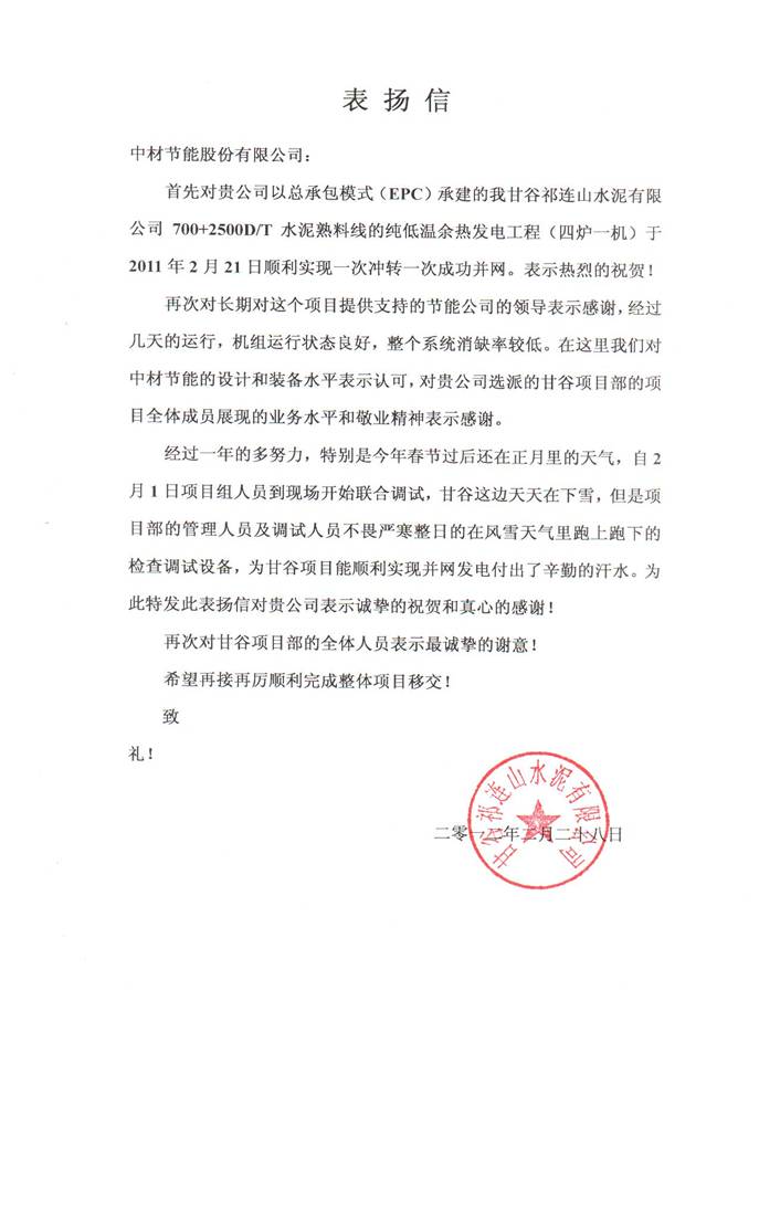 甘谷祁連山公司發(fā)來表揚(yáng)信