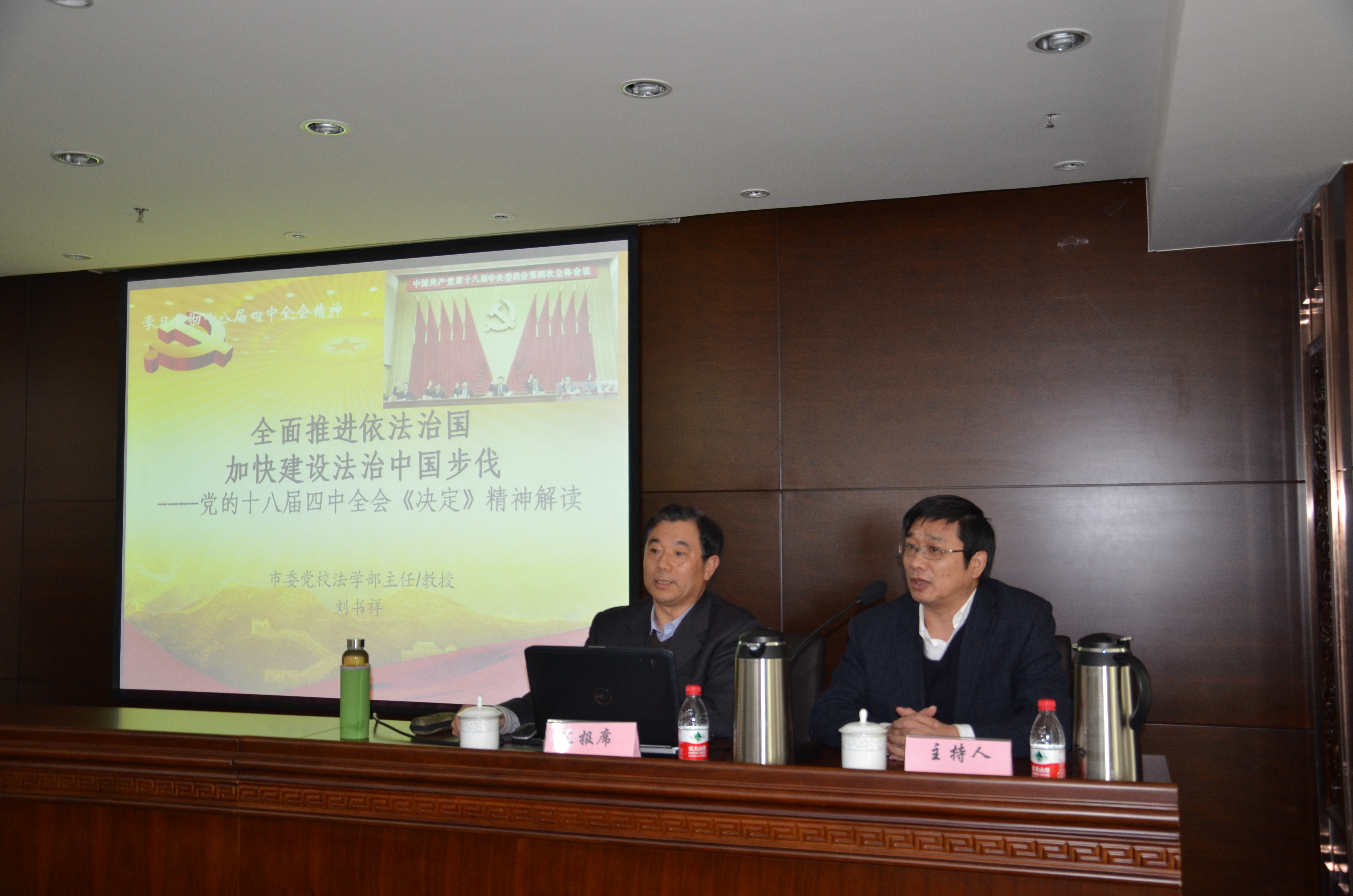 會(huì)上,劉書祥教授把黨的十八屆三中全會(huì)和四中全會(huì)緊密聯(lián)系,深入分析了全面推進(jìn)依法治國(guó)與全面深化改革的關(guān)系;回顧了我黨依法治國(guó)理念的形成和發(fā)展,進(jìn)一步明確了《中共中央關(guān)于全面推進(jìn)依法治國(guó)若干重大問題的決定》是黨的法治建設(shè)理論與實(shí)踐深化的重大成果;從《決定》的重大意義、指導(dǎo)思想、總體目標(biāo)、基本原則、主要任務(wù)入手,進(jìn)一步闡釋了《決定》的新觀點(diǎn)、新舉措。報(bào)告緊扣主題、條理分明、分析透徹,對(duì)于各級(jí)領(lǐng)導(dǎo)干部全面理解、準(zhǔn)確把握四中全會(huì)精神進(jìn)行深入解讀和引領(lǐng),起到了重要的啟發(fā)和推動(dòng)作用。