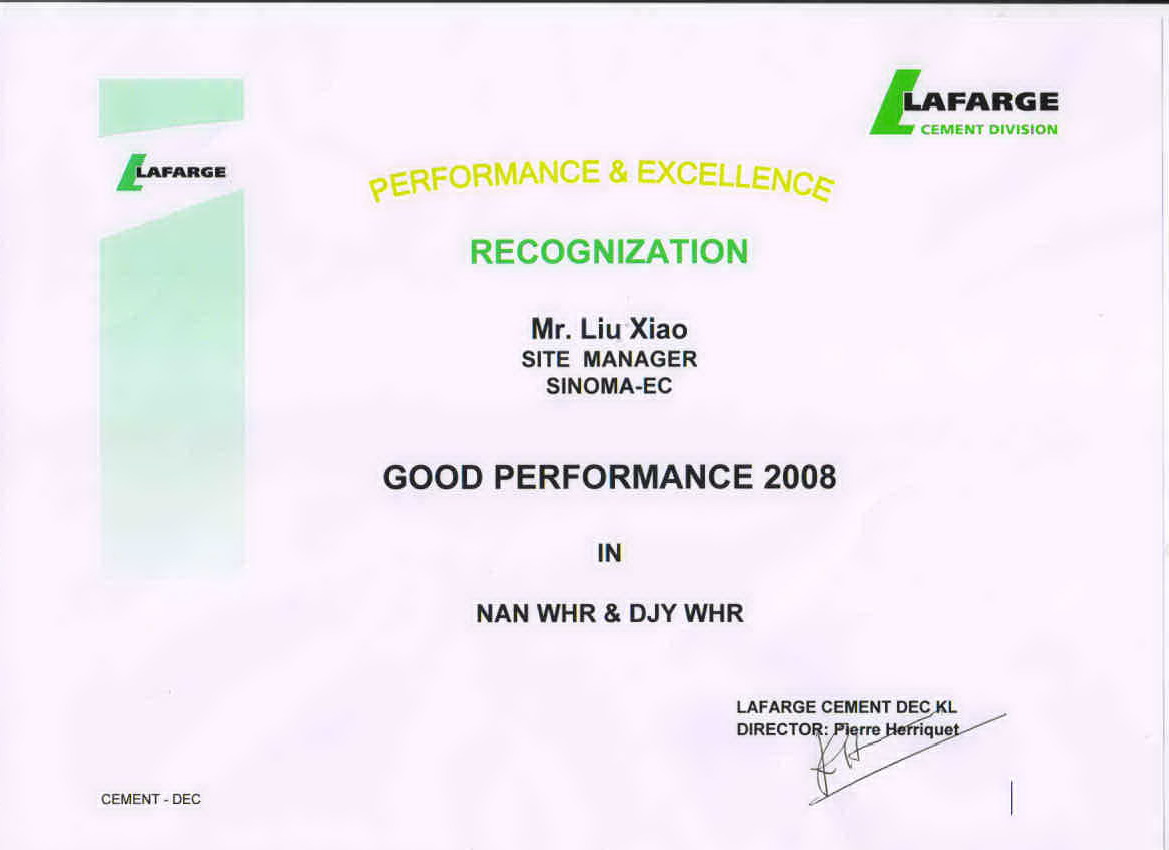 拉法基頒發(fā)給現(xiàn)場經(jīng)理劉宵的榮譽證書