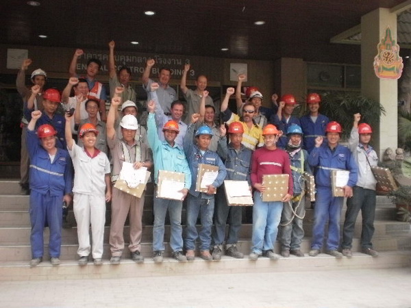 From left to right: Safety Consulter Mr. Guy, Project Manager Mr. Prapan, Chairman of Siam City Cement Public Company Mr. Philip, Project Manager of Sinoma EC Mr.Hou YaoGuang, Site Consulter Mr. Bill, Safety Team Leader Mr.Sumrit, and Site Manager of Sinoma EC Mr.Jiang XiangDong.